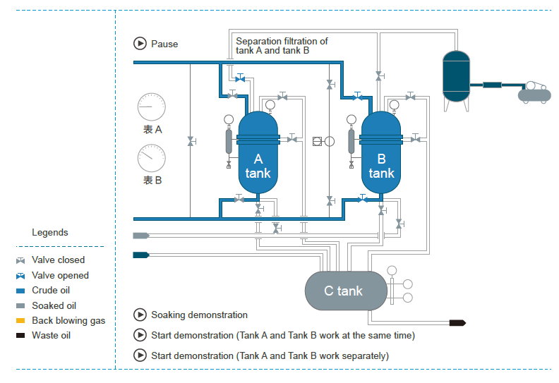 The whole facility could use the filtered clean liquid for back washing to remove the filtration cakes deposited on the outer surfaces of filter cartridges. During back washing, the control program will control the feeding valve and discharge valve of one group of filters to cut off the feeding line and open the discharge line of the filter group to rapidly remove the filtration cakes under the pressure from cleaning liquid and discharge the waste oil into the sewage and recovery channel. Then the discharge valve will be closed and inlet valve will be opened to start the normal filtration operation.